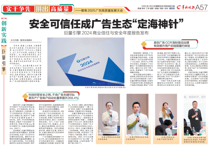 1月15日,由巨量引擎主办的“商业安全开放日”在北京举行。活动现场,巨量引擎重磅发布《2024商业信任与安全年度报告》(以下简称《报告》)。《报告》指出,2024年巨量引擎在不良广告治理、智能工具应用、用户指标创新、治理机制建设、后链路跟踪、广告主教育激励等方面进步显著。